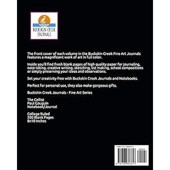 The front cover of each volume in the Buckskin Creek Fine Art Journals features a magnificent work of art in full color. Inside you'll find fresh blank pages of high quality paper for journaling, note taking, creative writing, sketching, list making, school compositions or simply preserving your ideas and observations. Set your creativity free with Buckskin Creek Journals and Notebooks. Perfect for personal use, they also make gorgeous gifts. Buckskin Creek Journals - Fine Art SeriesThe CellistPaul GauguinNotebook/JournalCollege Ruled200 Blank Pages8x10 Inches
