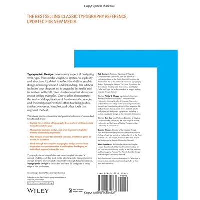 From the Back Cover THE BESTSELLING CLASSIC TYPOGRAPHY REFERENCE, UPDATED FOR NEW MEDIA Typographic Design covers every aspect of designing with type, from stroke weight, to syntax, to legibility, and structure. Updated to reflect the shift in graphic design consumption and understanding, this edition includes new chapters on typography in media and in motion, with full color illustrations that showcase recent design examples. Case studies demonstrate the real-world application of fundamental concepts, and the companion website offers teaching guides, student resources, samples, and other tools that augment the text. This classic text is a theoretical and practical reference of unmatched breadth and depth: Explore the evolution of typography from earliest written symbols to modern mobile apps Manipulate anatomy, syntax, and grids to preserve legibility without diminishing expression Plan designs around the intended outcome, whether in print, on screen, or in motion Work through the complete typographic design process from inspiration to experimentation to realization, developing an individual approach along the way Typography is an integral element in any graphic designer's arsenal of skills, and this book is the pivotal guide. Comprehensive enough for new learners and authoritative enough for professionals, Typographic Design is a valuable resource for designers at every stage of the profession. Read more About the Author Rob Carter is Professor Emeritus at Virginia Commonwealth University, and has served as a visiting professor at the Gerrit Rietveld Academy in Amsterdam. He is the author of American Typography Today, Typographic Design: The Great Typefaces, the five-volume Working with Type series, and Digital Color and Type. He is also coauthor of Meggs: Making Graphic Design History. The late Philip B. Meggs was School of the Arts Research Professor at Virginia Commonwealth University; visiting faculty at Syracuse University and the National College of Art and Design in Dublin, Ireland; and contributing editor to Print magazine. He authored more than a dozen books and 150 articles and papers on design and typography, including a section on graphic design in Encyclopedia Britannica. The late Ben Day was Professor Emeritus at Virginia Commonwealth University. He also taught at Boston University and had been a Visiting Designer at the University of Connecticut. Sandra Maxa is Director of the Graphic Design Post Baccalaureate Program at the Maryland Institute College of Art, has served as visiting faculty at the Pratt Institute, and has taught at Parsons The New School for Design and at Rutgers UniversityNewark Mark Sanders is full-time faculty in the Graphic Design department at Maryland Institute College of Art, has served as visiting faculty at the Pratt Institute, and has taught at Parsons The New School for Design and at Rutgers UniversityNewark. Both Sandra and Mark are Partners at Q Collective, a visual communication and branding studio in New York and Baltimore. Read more